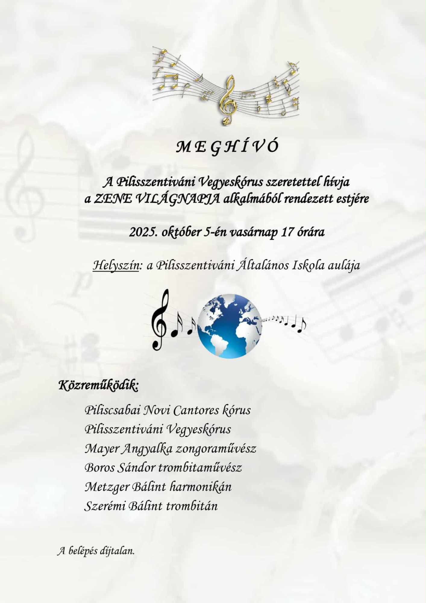 A Zene Világnapja alkalmából koncertet szervez a Pilisszentiváni Vegyeskórus, október 5-én, vasárnap 17 órától az iskola aulájában. Nagy szeretettel várnak mindenkit!