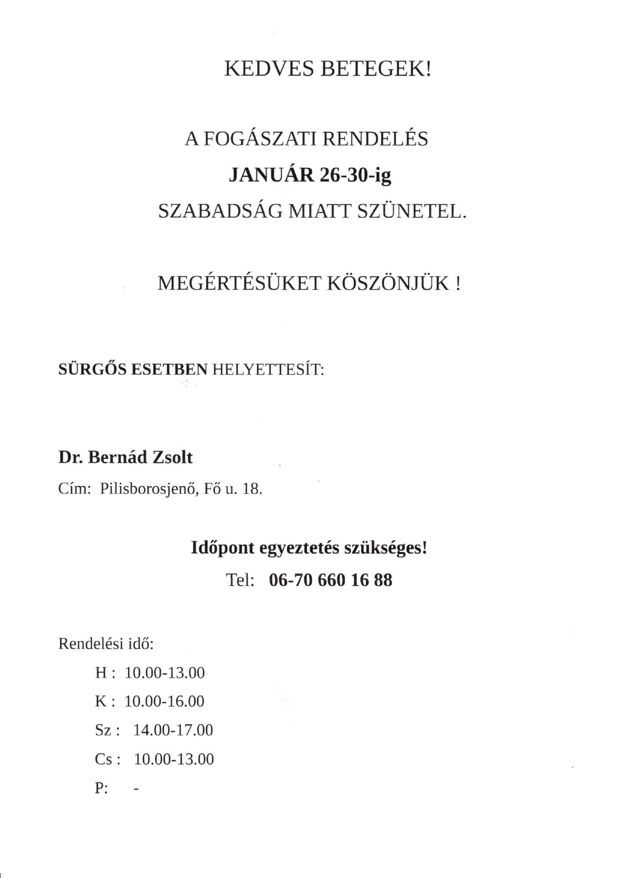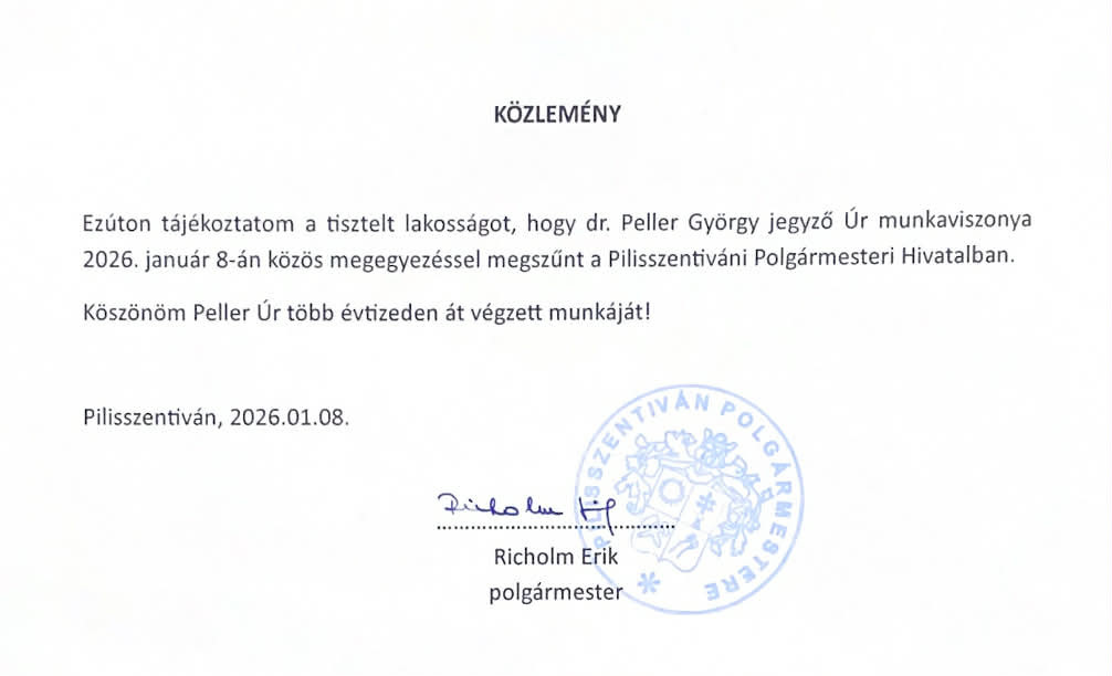 Ezúton tájékoztatom a tisztelt lakosokat, hogy dr. Peller György jegyző Úr munkaviszonya 2026. január 8-án közös megegyezéssel megszűnt a Pilisszentiváni Polgármesteri Hivatalban.
