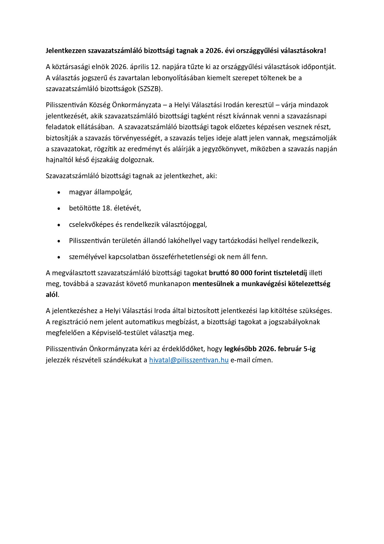 A köztársasági elnök 2026. április 12. napjára tűzte ki az országgyűlési választások időpontját. A választás jogszerű és zavartalan lebonyolításában kiemelt szerepet töltenek be a szavazatszámláló bizottságok (SZSZB). Részletek > > >