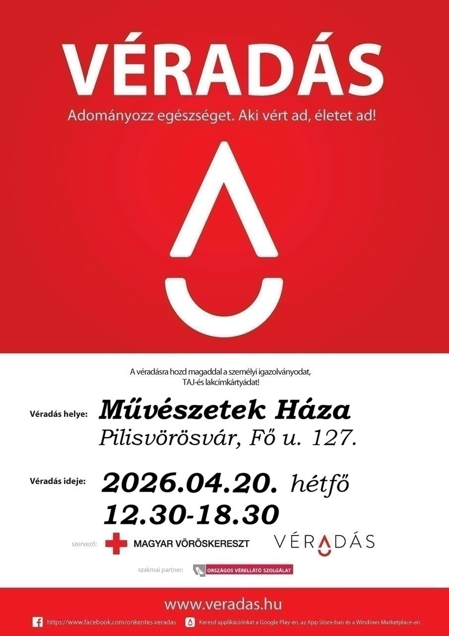 Április 20-án, hétfőn várja a Magyar Vöröskereszt a véradókat Pilisvörösváron, a Művészetek Házában. Részletek > > >