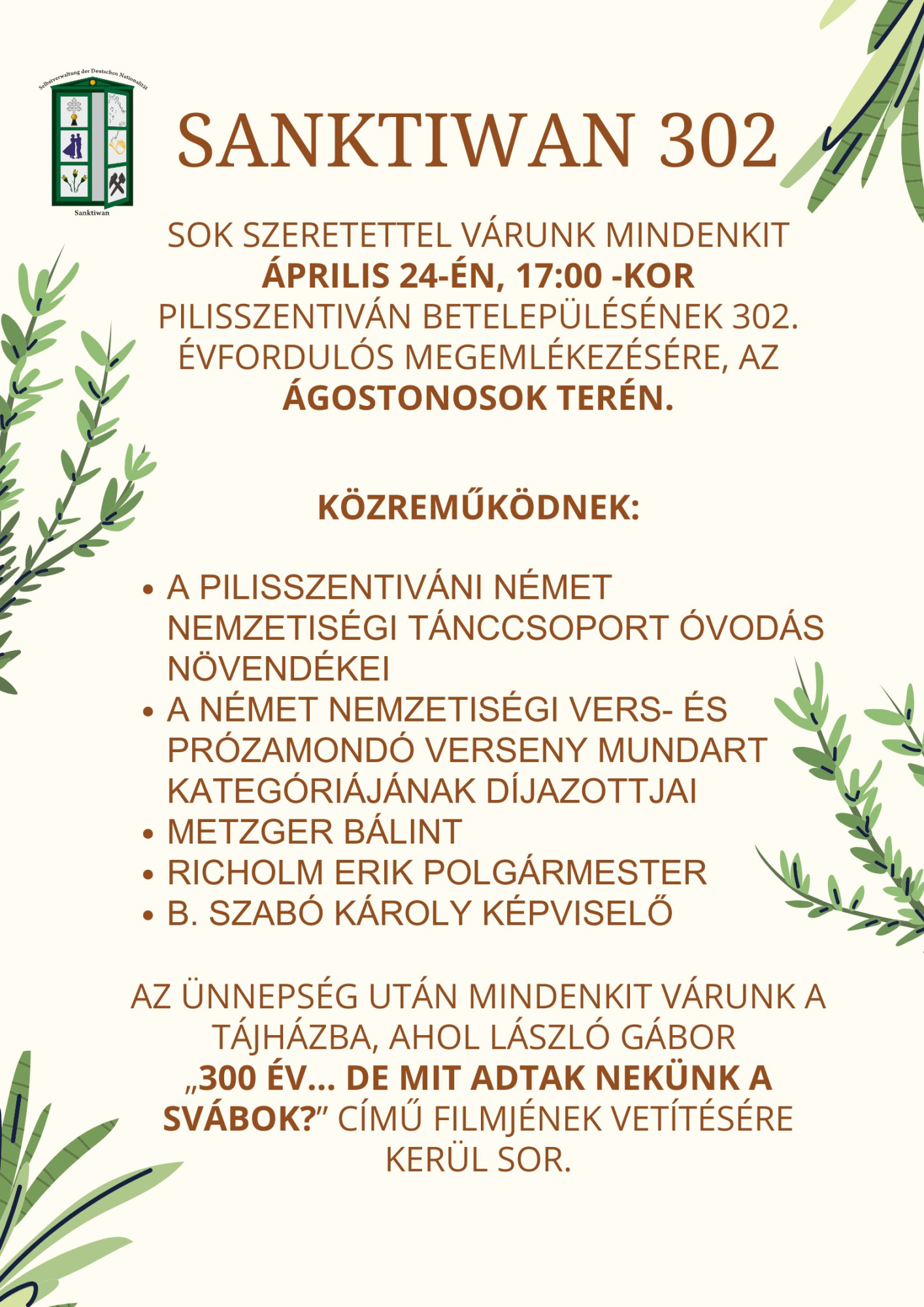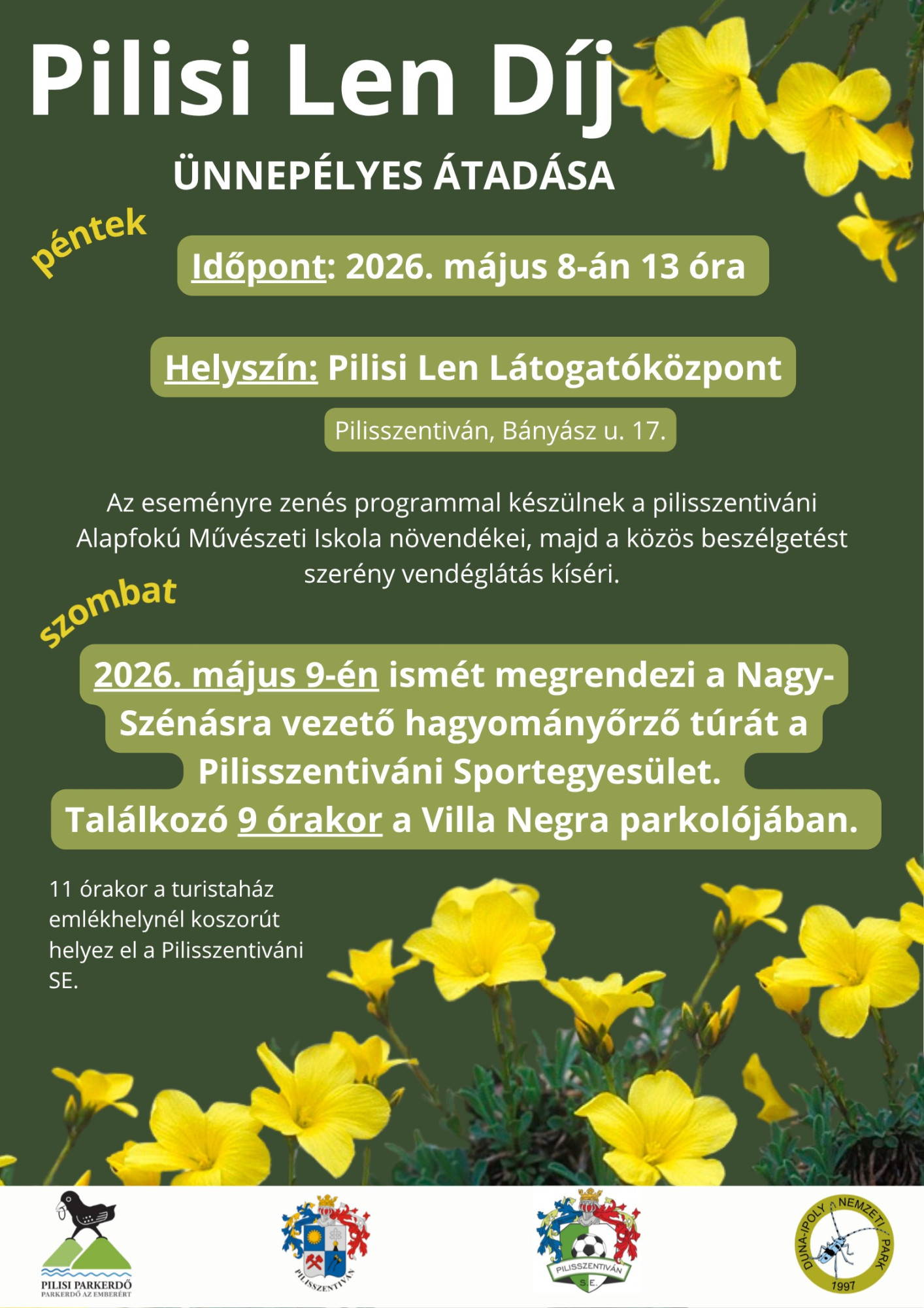 Pilisszentiván Község Önkormányzata azért hozta létre kitüntető címeit, hogy méltó módon elismerhesse mindazokat a személyeket és szervezeteket, akik kiemelkedő módon szolgálják a helyi közösséget. Ennek szellemében a képviselő-testület 2021-ben alapította meg a Pilisi Len díjat, amelynek célja azon magyar és külföldi állampolgárok, illetve szervezetek munkájának elismerése, akik Pilisszentiván természeti értékeinek megóvásában kimagasló tevékenységet végeztek vagy végeznek. A díjátadó ünnepségre 2026. május 8-án 13:00 órától kerül sor Pilisszentivánon, a Pilisi Len Látogatóközpontban (Bányász utca 17.).