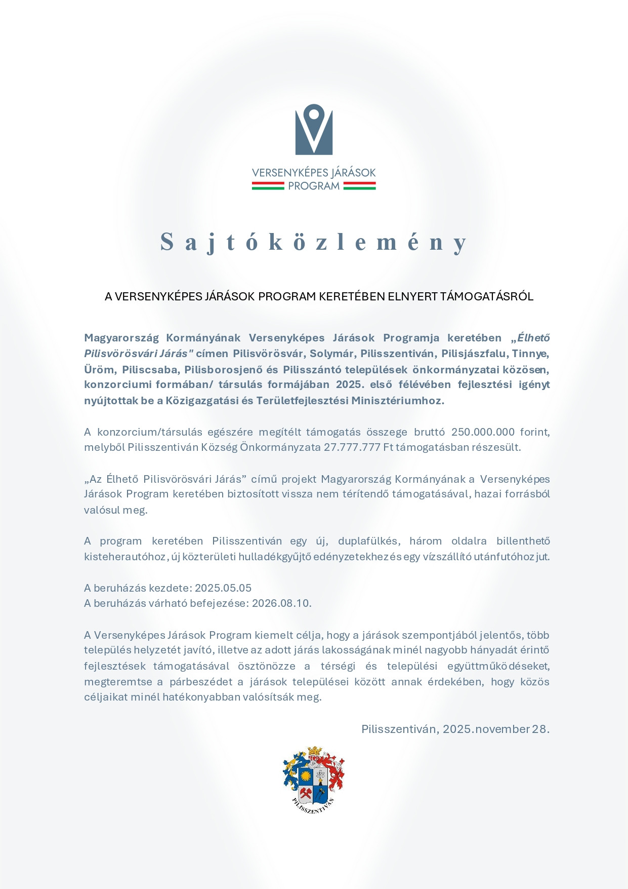 Sajtóközlemény a Versenyképes Járások Program I. felhívásának megvalósításával kapcsolatban Részletek > > >