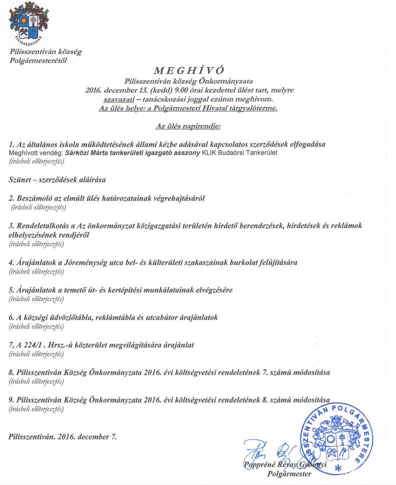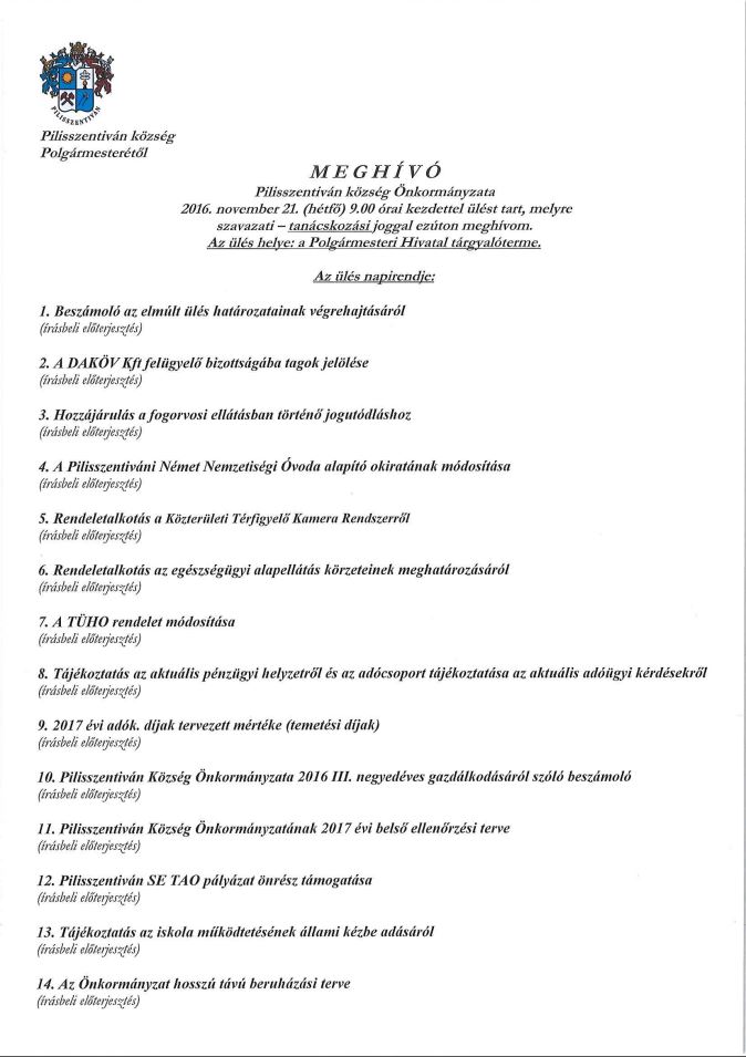 2016. november 21. (hétfő) 9.00 órai kezdettel ülést tart, melyre