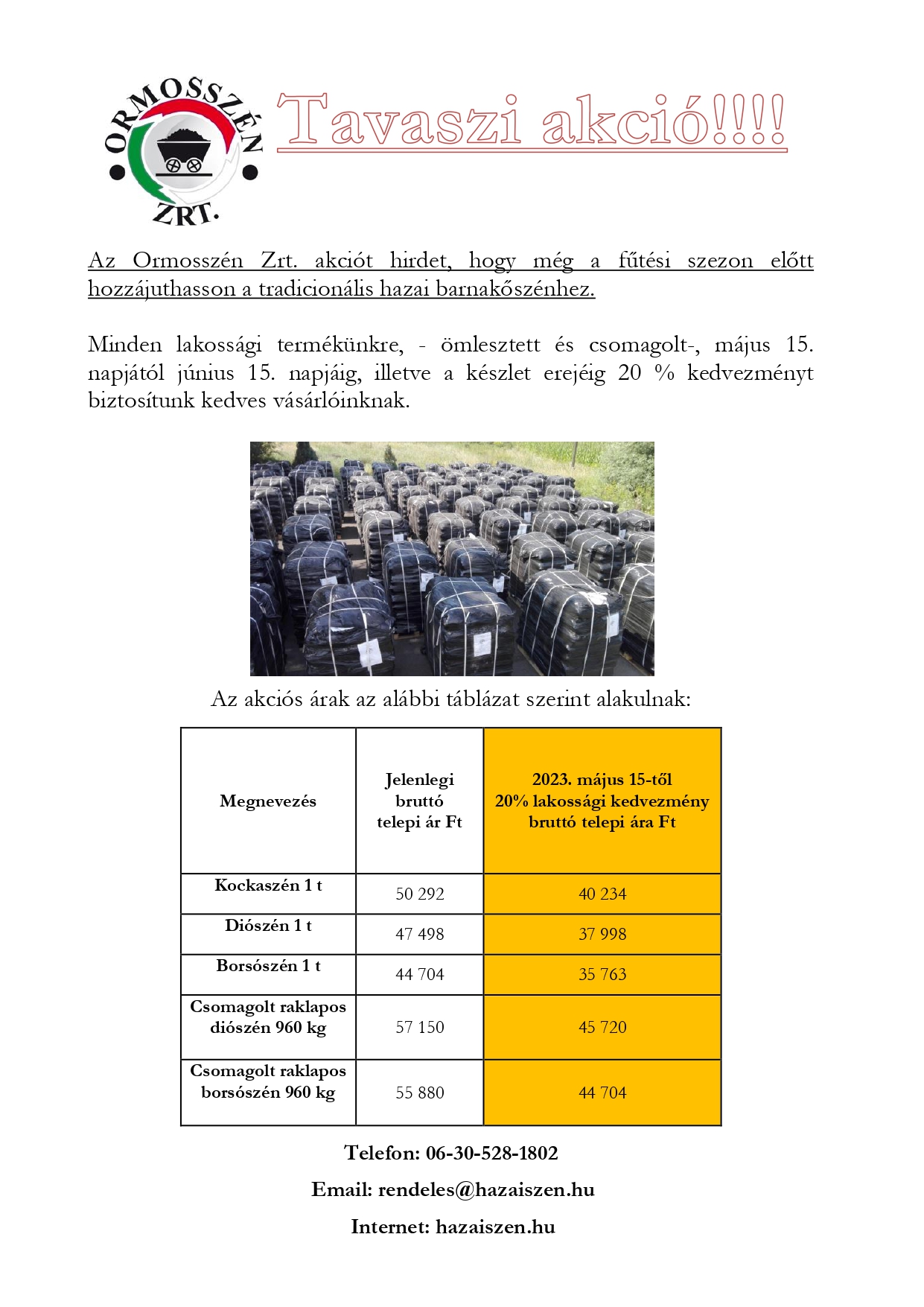 Ezért az Ormosszén Zrt. minden lakossági termékére, - így az ömlesztett és csomagolt termékekre is, - 2023. május 15. napjától 2023. június 15. napjáig, illetve a készlet erejéig, 20% kedvezményt biztosít a mellékelt tájékoztató szerinti jelenlegi telepi bruttó forint árakból a lakossági vásárlók részére. Részletek - a mellékelt tájékoztató - a képre kattintva érhető el, vagy a csatolmányból letölthető.