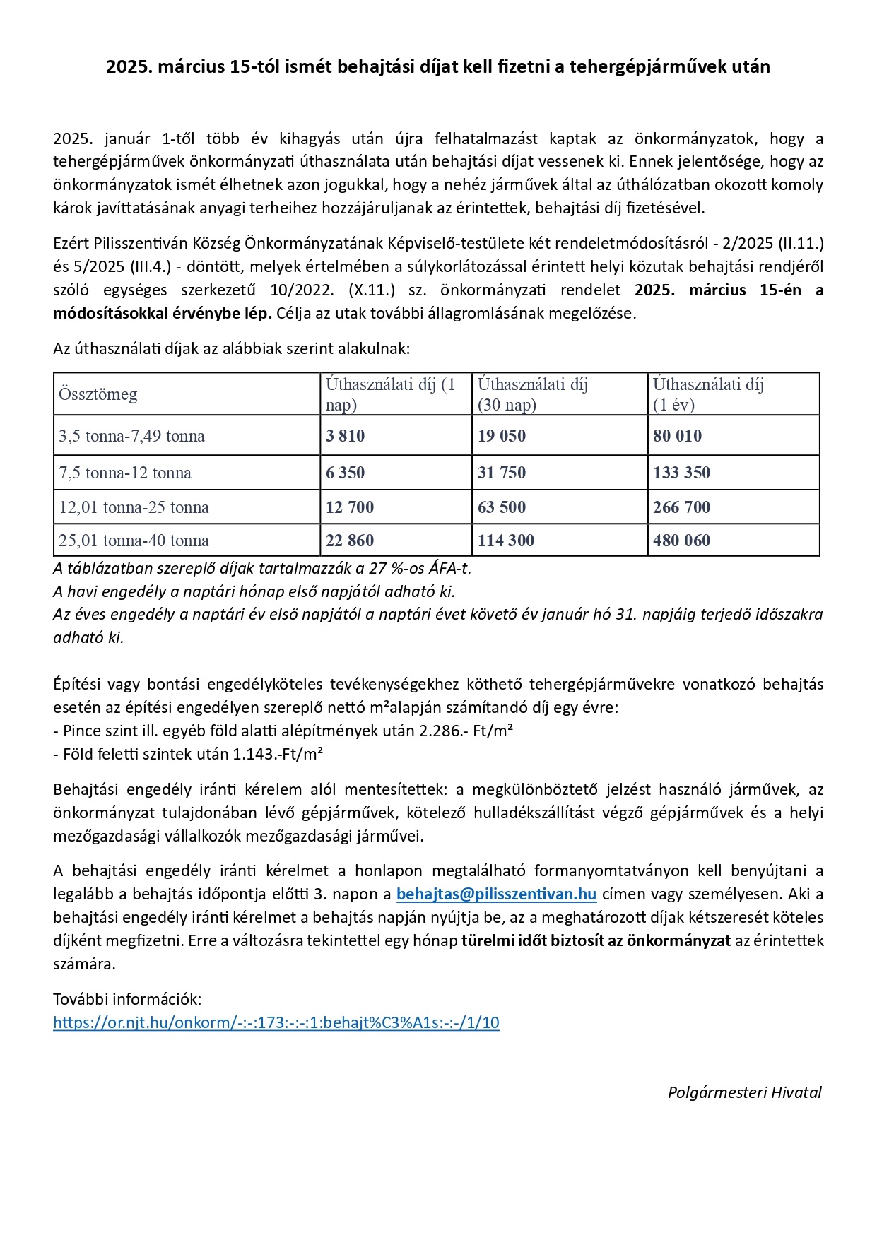 2025. január 1-től több év kihagyás után újra felhatalmazást kaptak az önkormányzatok, hogy a tehergépjárművek önkormányzati úthasználata után behajtási díjat vessenek ki. Ennek jelentősége, hogy az önkormányzatok ismét élhetnek azon jogukkal, hogy a nehéz járművek által az úthálózatban okozott komoly károk javíttatásának anyagi terheihez hozzájáruljanak az érintettek, behajtási díj fizetésével.