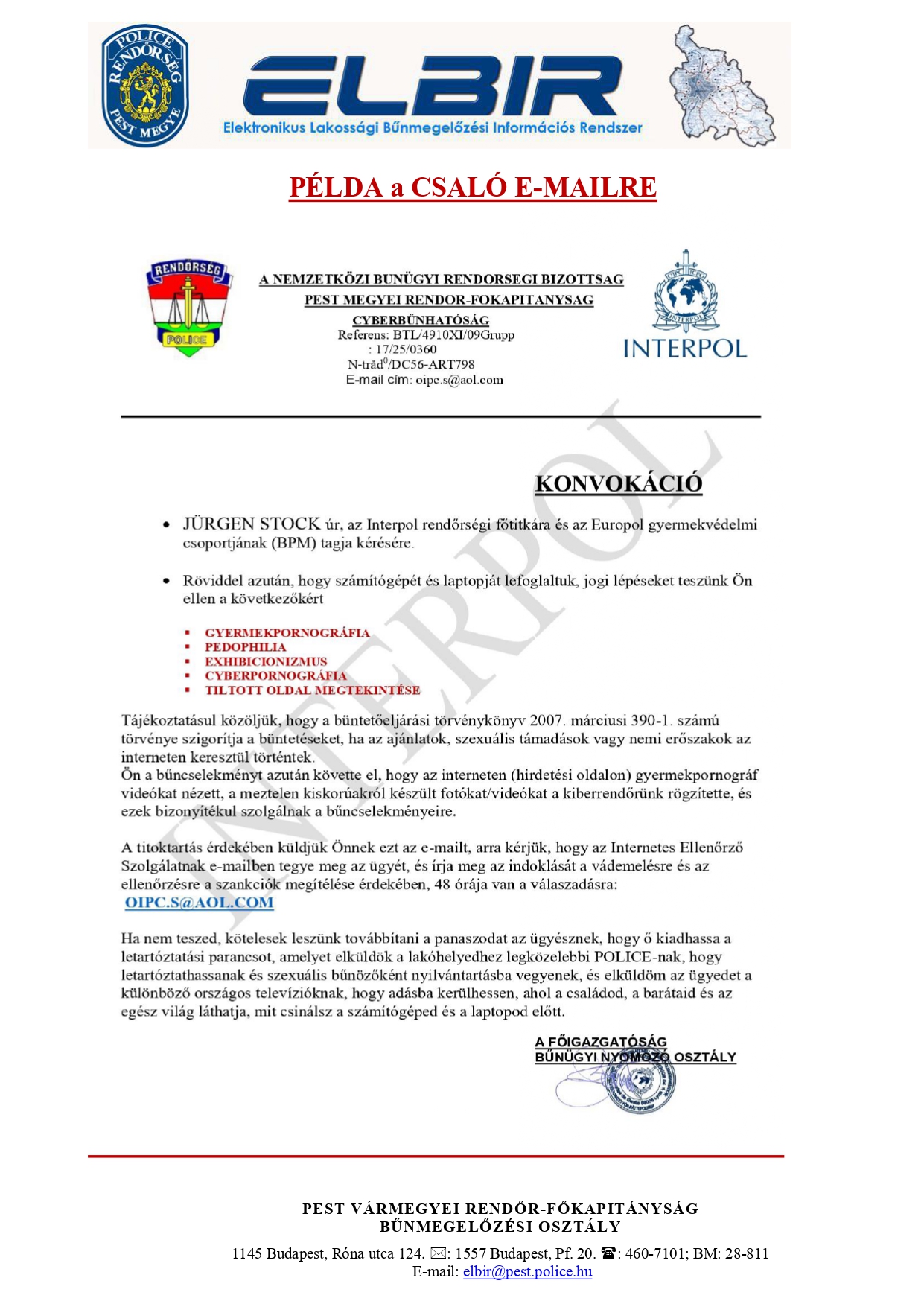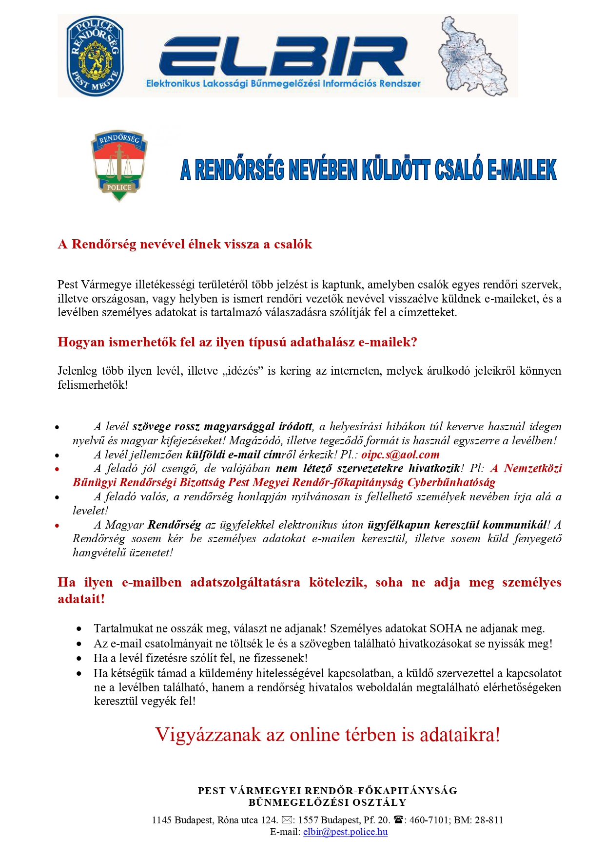 Pest Vármegye illetékességi területéről több jelzés érkezett, amelyben csalók egyes rendőri szervek, illetve országosan, vagy helyben is ismert rendőri vezetők nevével visszaélve küldnek e-maileket, és a levélben személyes adatokat is tartalmazó válaszadásra szólítják fel a címzetteket. További információkat a csatolmányból tudhatnak meg. Legyünk óvatosak!